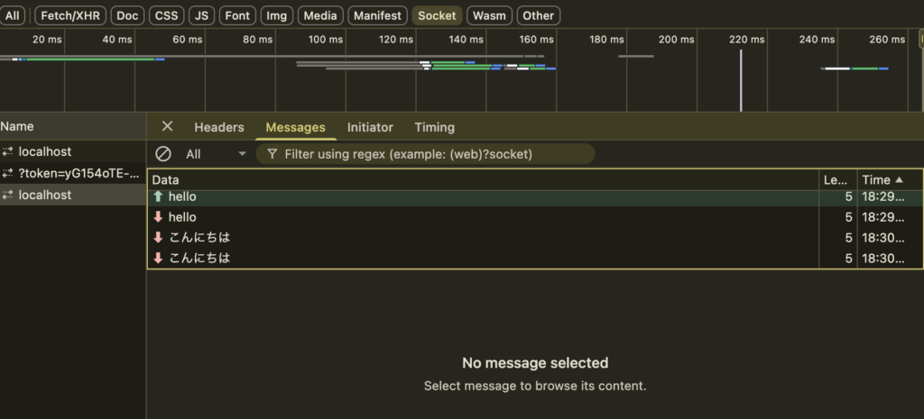 を実行。- メッセージがサーバーへ送られ、他のクライアントにもブロードキャストされる。