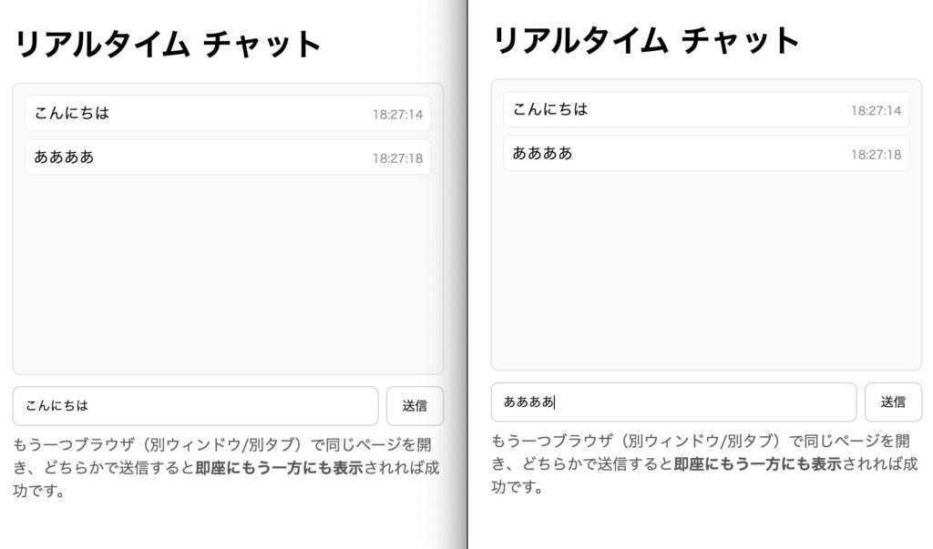 - ブラウザAの入力欄に文字を入れて 送信 → ブラウザBにも即時に表示。