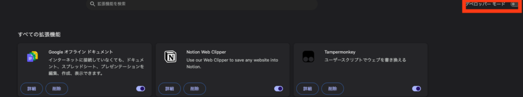 ブラウザのアドレスバーに「 chrome://extensions/ 」と入力する - 画面右上のデベロッパーモードのトグルボタンをオンにする