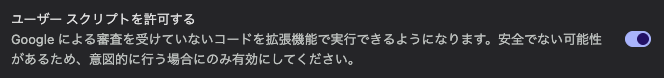 Google Chromeのアップデートにより、開発者モードの有効化と、拡張機能に対してユーザースクリプトを有効化する必要があります。